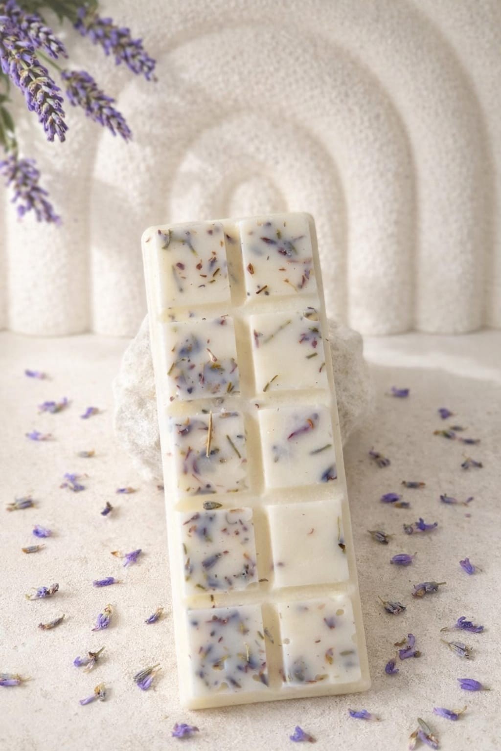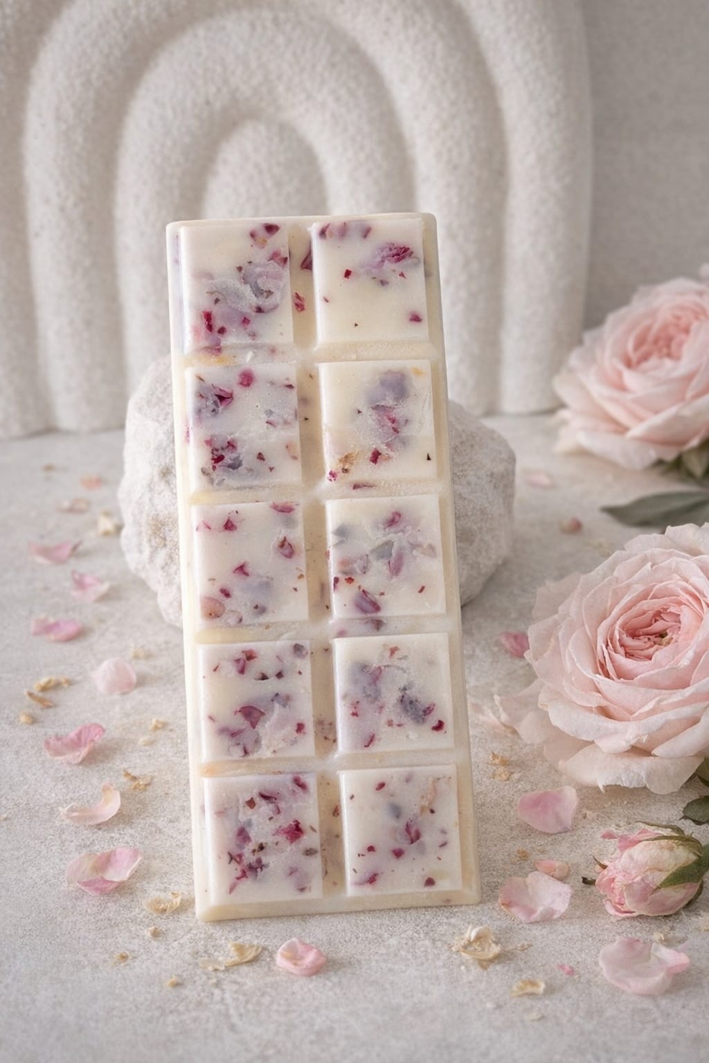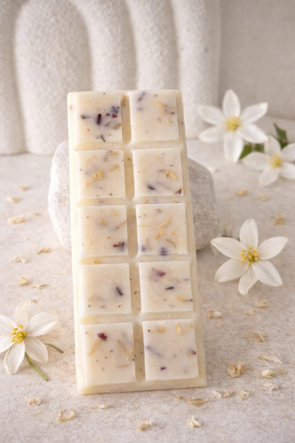Ce fondant parfumé en forme de tablette est entièrement fabriqué a la main avec de la cire végétale de soja, soigneusement coulée avec des petites fleurs séchées en accord avec le parfum, elle offre une odeur douce et envellopante.