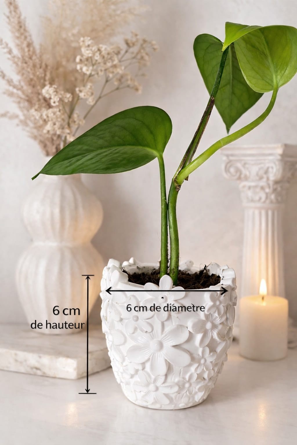 Chaque pièce est artisanale, ce qui la rend unique et lui donne tout son charme. Sa finition blanche met en valeur les détails floraux et sublime vos plantes tout en apportant une note lumineuse à votre décoration.