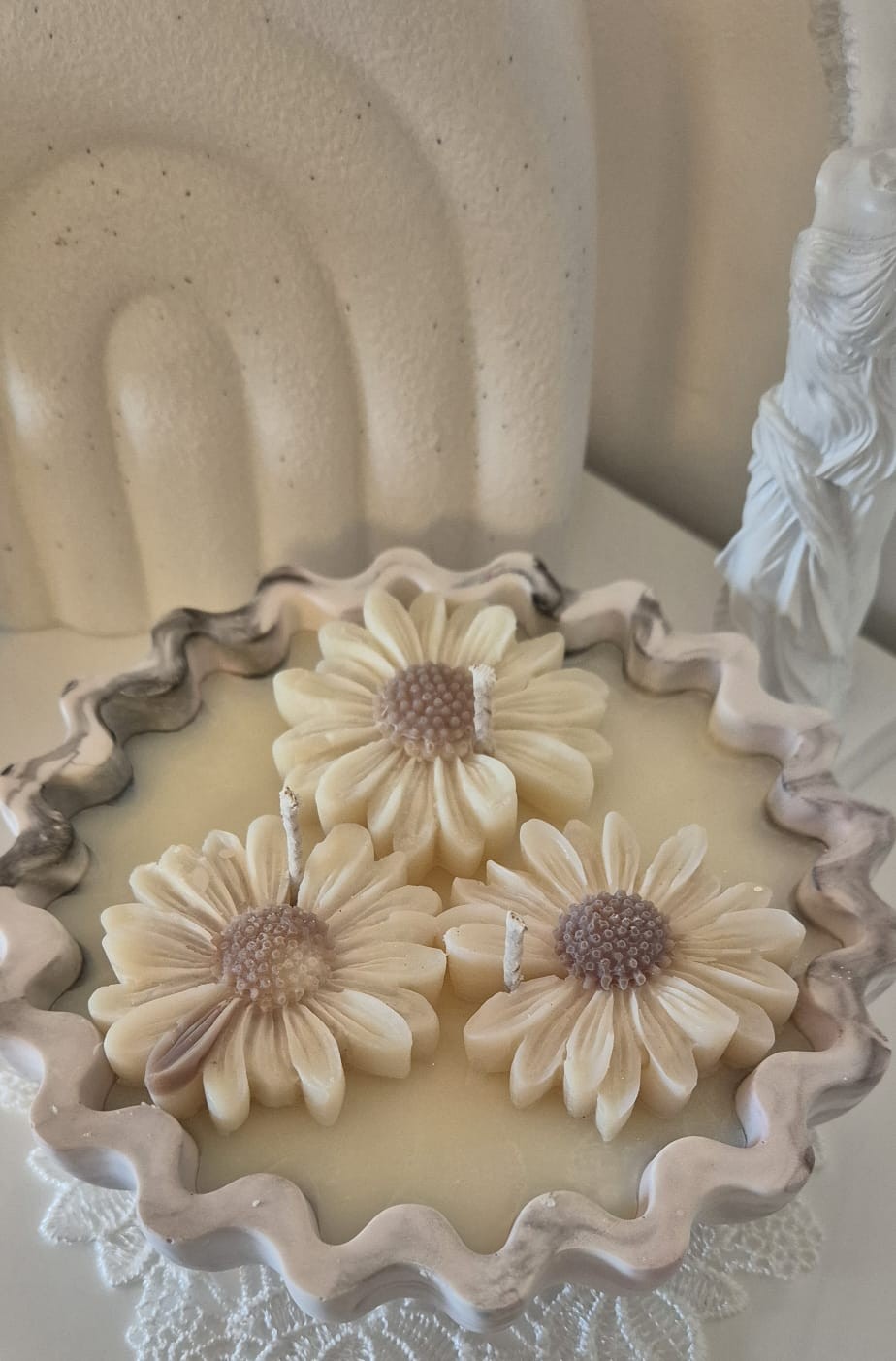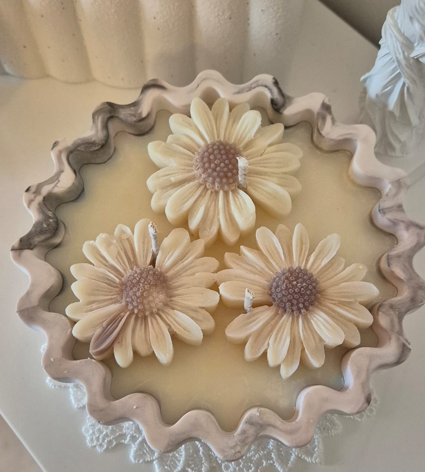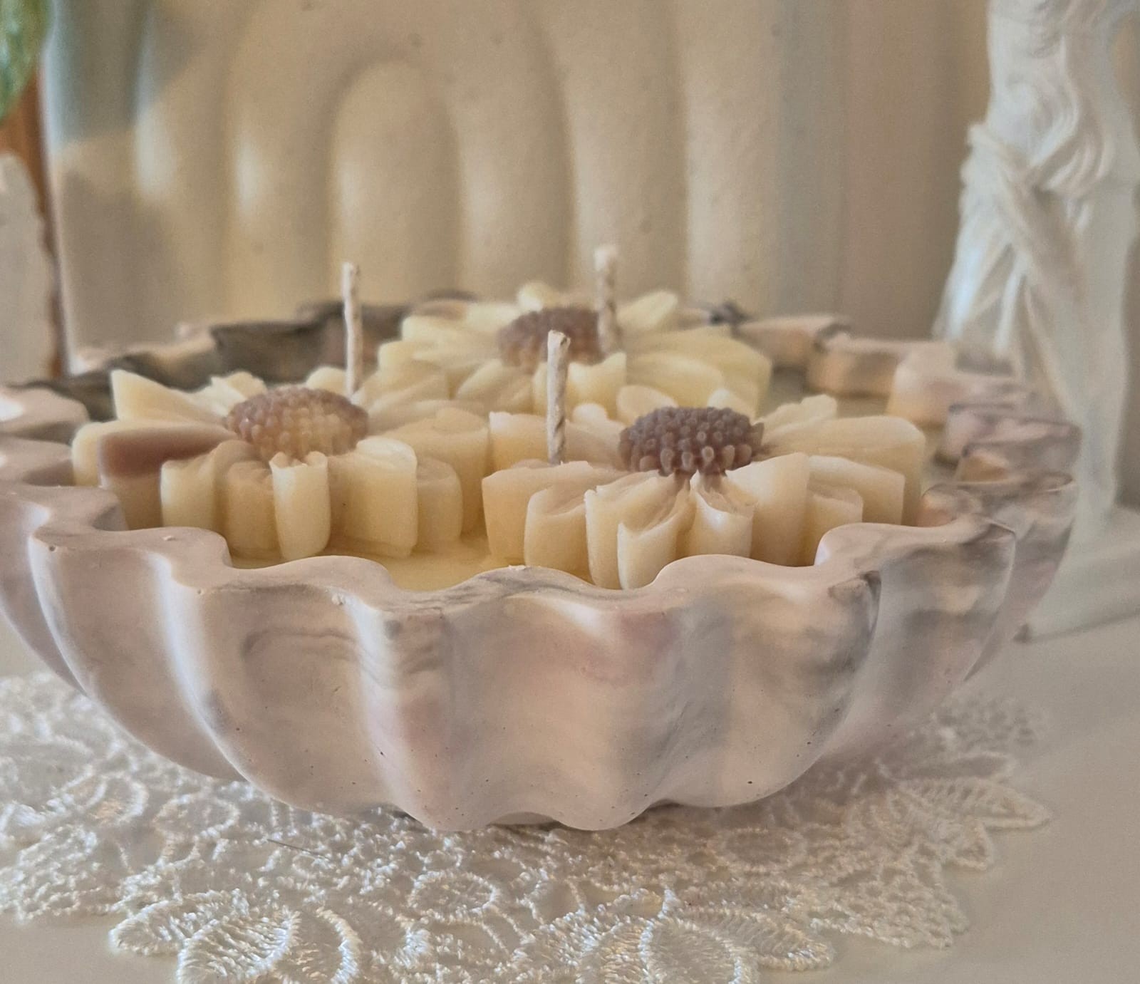 Coulée à la main dans un joli contenant aux bords ondulés avec un effet marbré, elle se distingue par ses trois fleurs délicatement sculptées en cire, qui lui donnent un aspect raffiné et poétique.