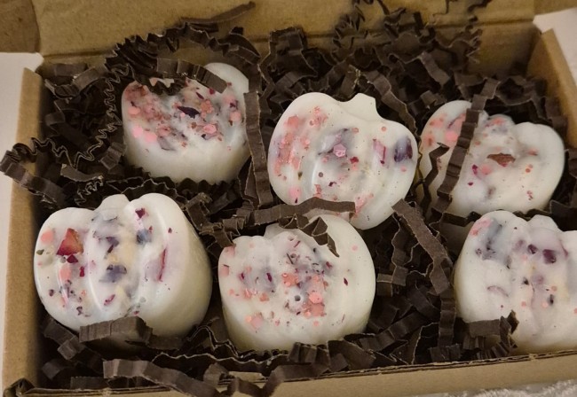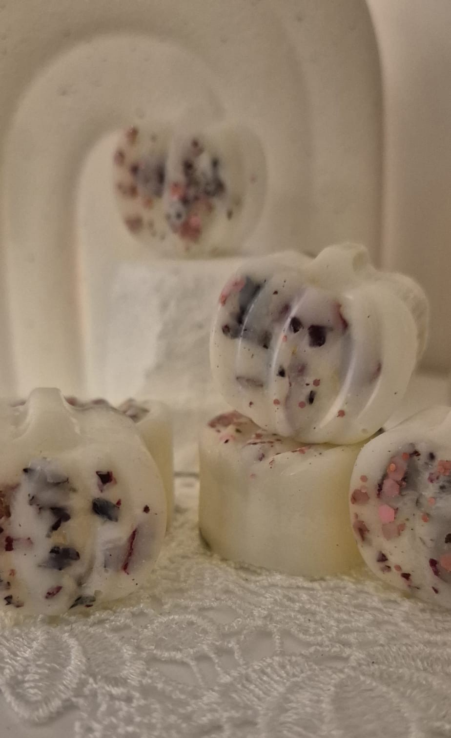 Chaque fondant est coulé avec de la cire végétal de soja de qualité et délicatement décoré de véritables fleurs sechées provenant de mon jardin, rendant chaque pièce unique.